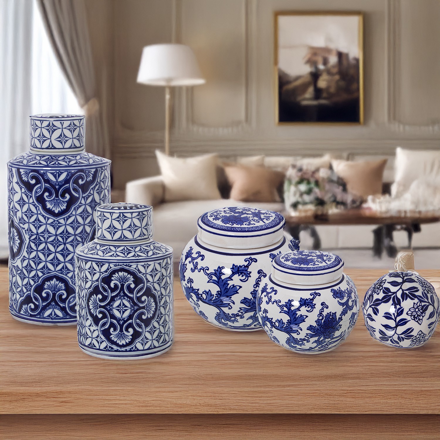 Caja Cerámica Blanco Hojas Azules Ø10x11cm