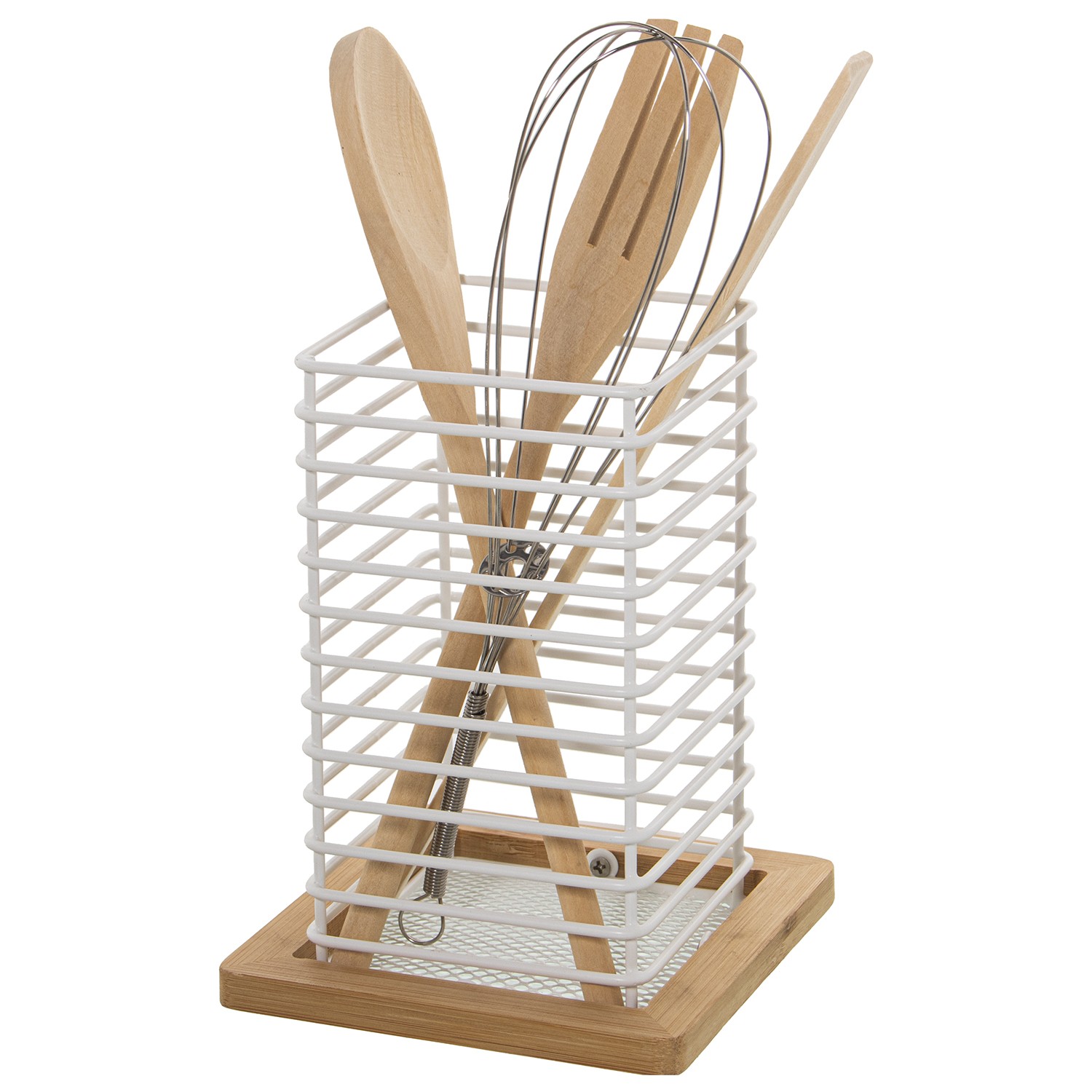 Porte-ustensiles En Métal Avec Cadre En Bois - Blanc (ustensiles Non Inclus)- 12x12x16cm, Recipiente:9x9x16
